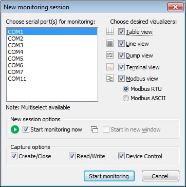 Il software offre quattro modalità di visualizzazione. Sono le viste Linea, Tabella, Terminale, Dump e Modbus. Puoi selezionarle tutte o solo quelle di tuo interesse.